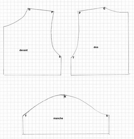 Marquer (au crayon ou avec un point de bâti) les points P, Q, S et T sur les devants et le dos, et les points R, S et T sur les manches.